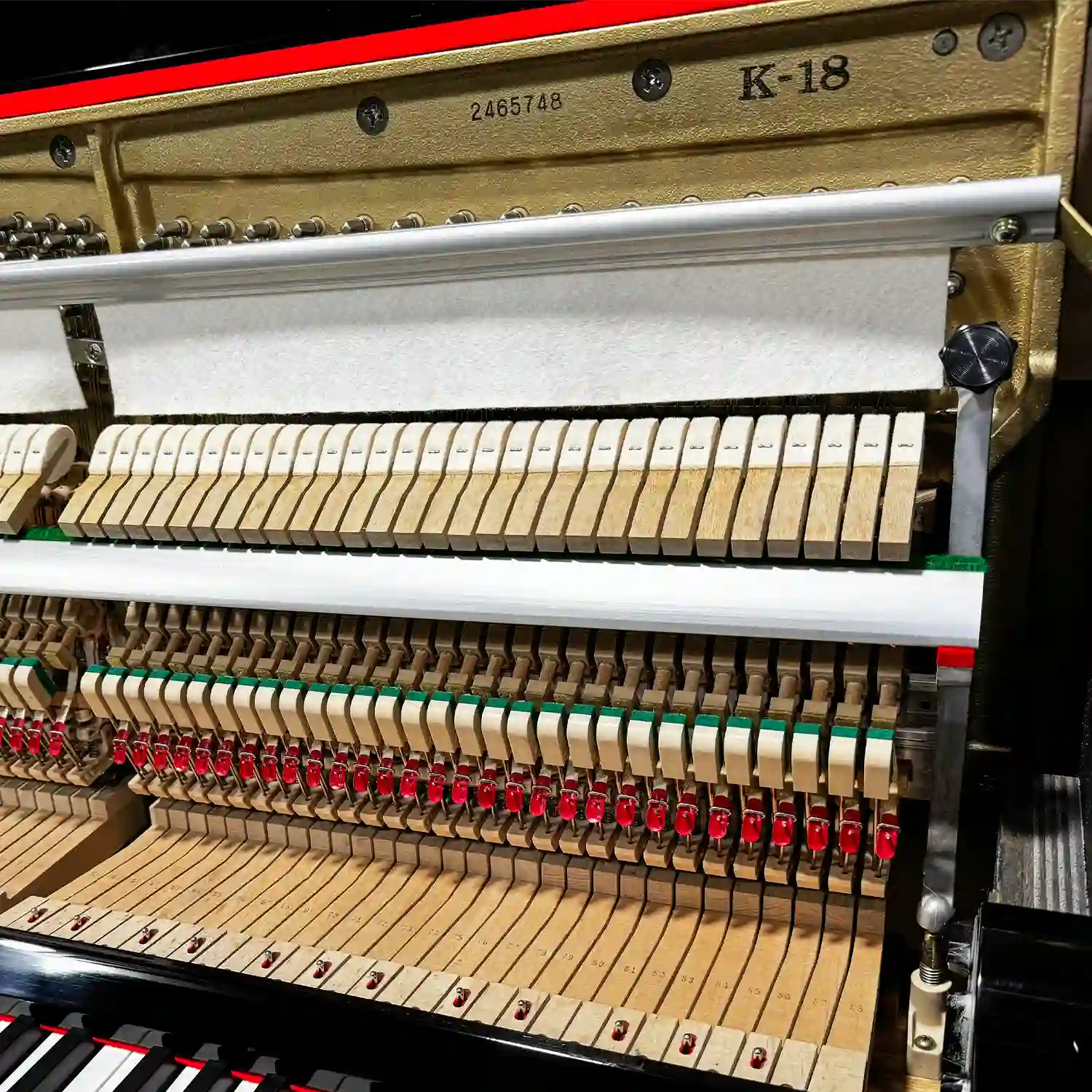 Kawai K-18 là mẫu upright piano cơ cao 121cm được sản xuất tại Nhật Bản vào khoảng 2003–2004, thuộc phân khúc trung cấp trong K-Series đầu những năm 2000. Model piano cơ Kawai này được đánh giá cao nhờ bộ máy Millennium Action với vật liệu ABS-Styran – công nghệ giúp tăng độ bền cơ học và duy trì độ chính xác lâu dài trong điều kiện khí hậu nóng ẩm.